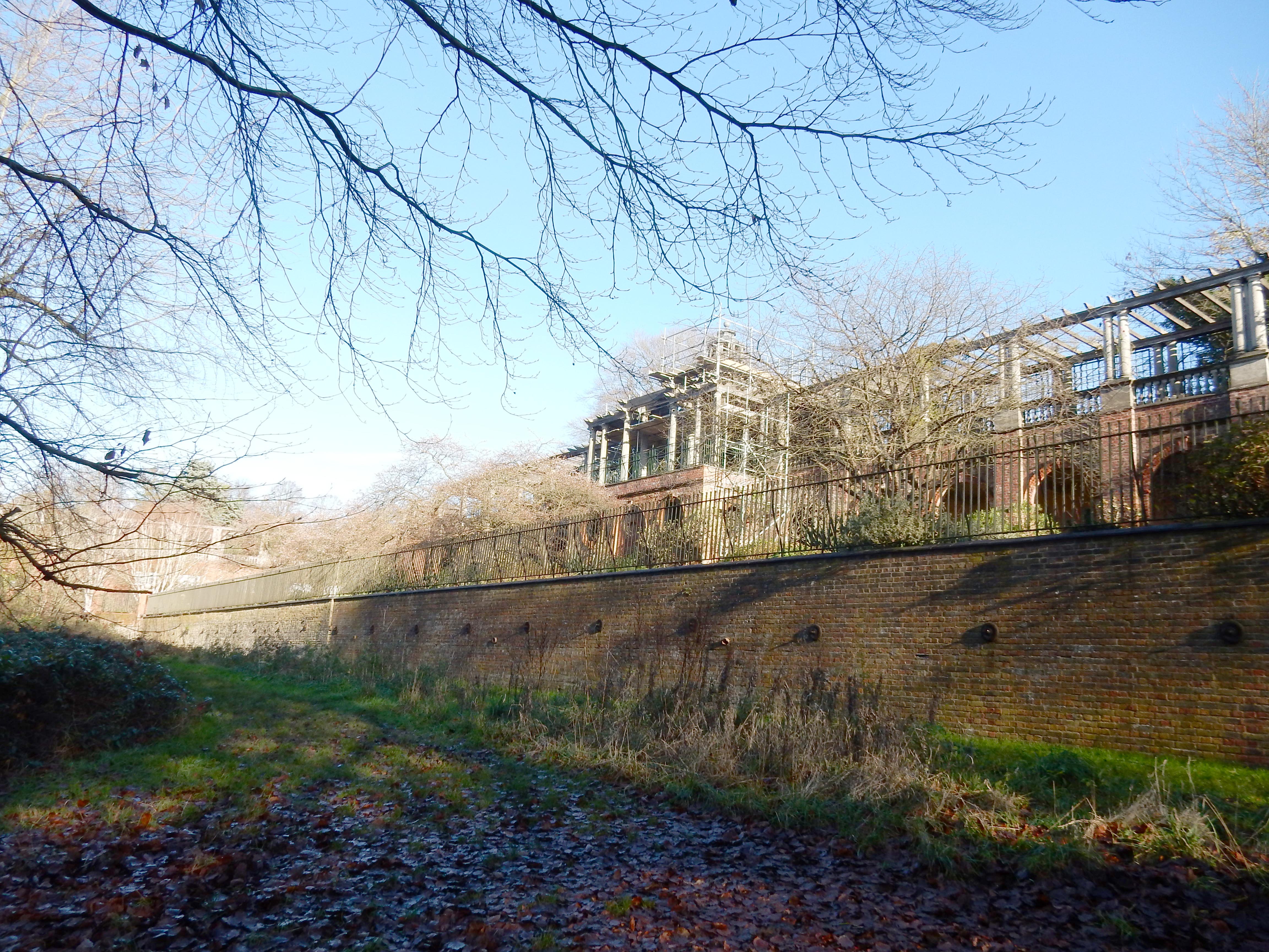 I certainly shan't be buying anyone a short stretch of North Circular, but that is about all else that you walk for the first 2½ miles, apart from residential back streets. This is a heavier dose than I receive on most of my London walks. It continues until Golders Hill Park. You may suppose this sculpture, ' Pipedreams', to be a bit of left-over sewer. Don't blame me; I'm not the sewage. Also owned by The City, this rather singular structure, half hidden by scaffolding, is The Hill Garden and Pergola. Had I time to explore it, then I might have discovered who was bonkers enough to design a pergola supported by a hundred classical columns. Mad, I tell you.