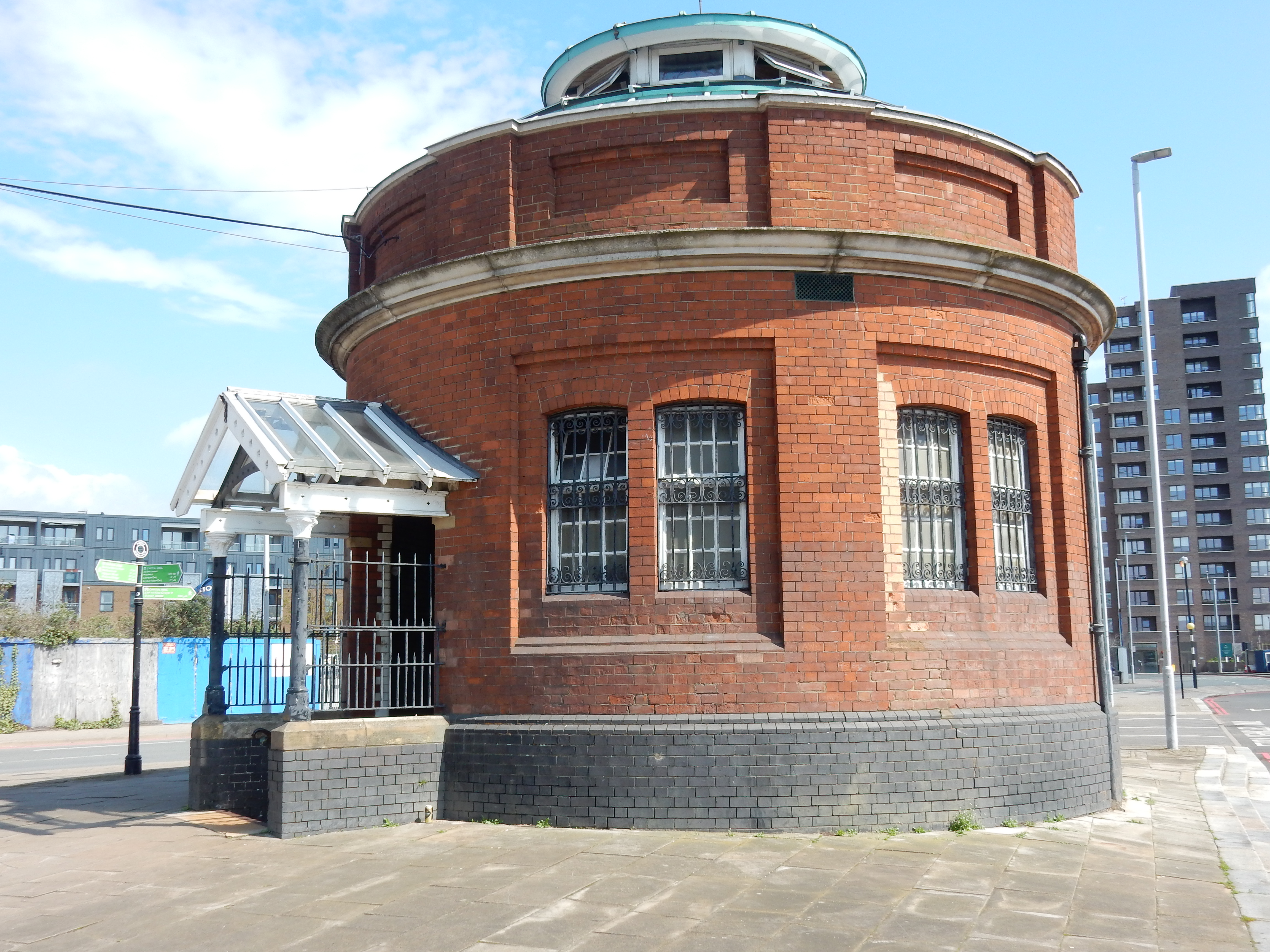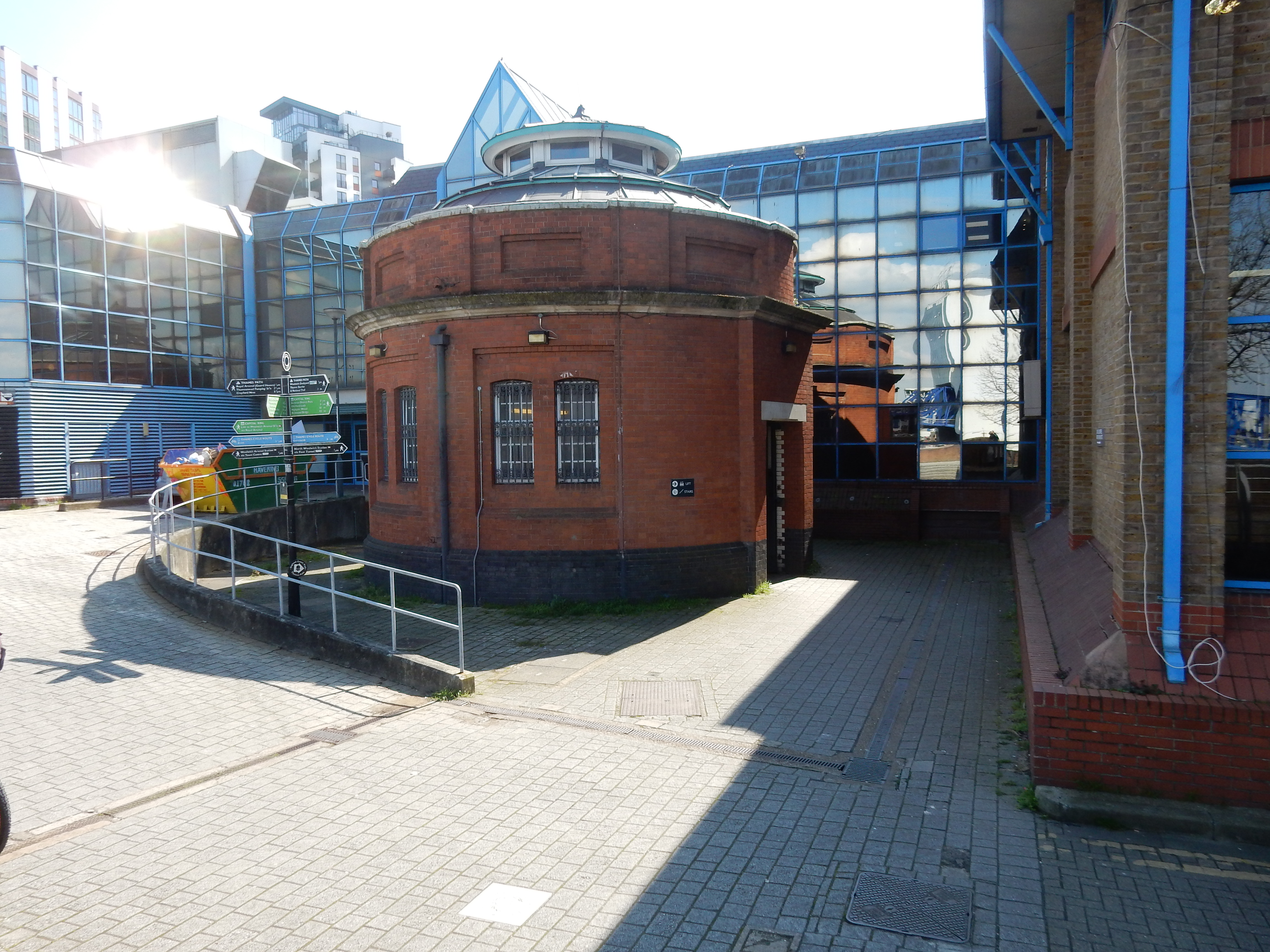 The north portal finds itself in rather different surroundings. Originally, it stood between Stanley Road (running close by the river) and some railway sidings branching off the line that ran to North Woolwich station from Connaught Road railway station at the Royal Victoria Dock. All that infrastructure is now either defunct or completely swept away. Some went after changes to the early train operators, visitation by the Luftwaffe, dwindling upstream docks usage, growing road haulage or 1980s redevelopments such as the DLR. Whatever, various grand designs for the area failed to materialise and the portal now stands isolated on a windsewpt terrace.